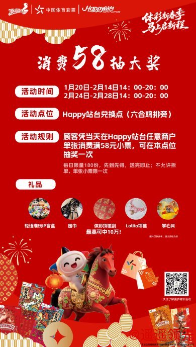 活动期间(1月20日至2月14日、2月24日至28日14:00-20:00),凡在Happy站台任意商户单张消费满58元,即可前往活动兑换点参与扭蛋抽奖。每日限量180份礼品,轻语潮玩IP盲盒、保暖围巾、Lolita项链、掌心月等好礼等你来拿,更有体彩顶呱刮彩票,最高可中10万元大奖,先到先得,送完即止!