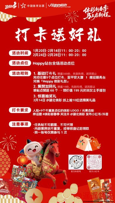 1月30日至2月14日、2月24日至28日11:00-20:00,全场17个核心打卡点等你来探索!与任意9个不重复点位的体彩LOGO或元素合影,带话题#体彩新春季并@湖北体彩发布小红书/抖音,即可至平安大厦1楼总服务台兑换“Happy体彩礼包”(限量300份)。若帖子点赞超68个,还能解锁价值199元的时尚女士手提包(限量10份)。2月14日,官方账号还将线上抽取10位幸运用户赠送定制精美礼品,原创内容才能参与哦~