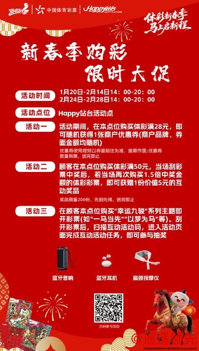 1月15日起,Happy站台四大活动点位(六合鸡排旁、1楼市集摊位等)同步开启购彩好礼:满28元即赠随机商户优惠券,吃喝玩乐一站式省钱;满50元中奖后,九游体育再购1.5倍中奖金额彩票,可获价值5元互动奖品(限量200份);购买“幸运九骏”系列即开票,扫码完成互动任务,即有机会抽取蓝牙音响、蓝牙耳机、肩颈按摩仪等惊喜好礼。