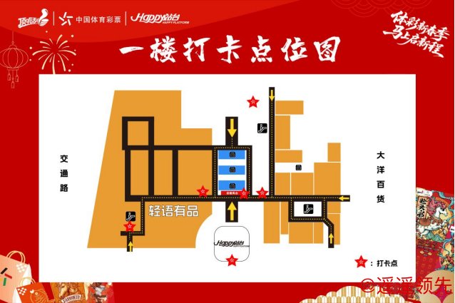 本次活动覆盖Happy站台正门口、C馆大堂、核心通道、楼梯等多个区域,以红金新春配色融合情人节浪漫元素,打造17个特色打卡点。乐小星高悬玻璃棚顶,“马上启新程”主题IP,还有新春祝福吊牌、灯笼等场景。C馆大堂的公益展示区,更将全方位呈现体彩公益理念,让市民在欢乐中感受公益力量。
