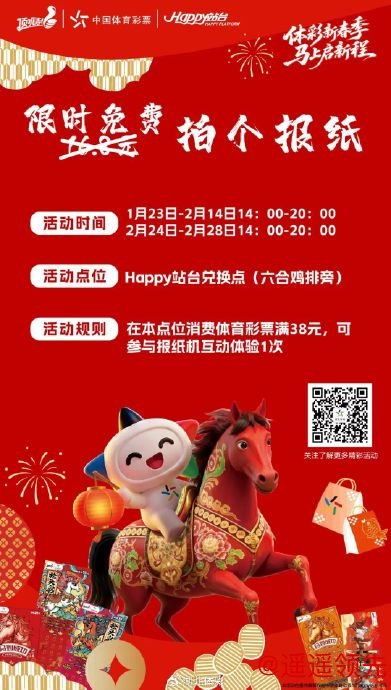 1月23日起,购彩满38元即可参与报纸机互动体验,定格新春美好瞬间。2月14日情人节当天,正门口将举办“爱在Happy·为爱添彩”双人挑战活动,通过公主抱挑战、默契问卷、公益签名墙三连打卡,可兑换密码卡片赢取盲盒、商户优惠券等好礼。更有体彩吉祥物乐小星全场巡游,陪你共度浪漫佳节~